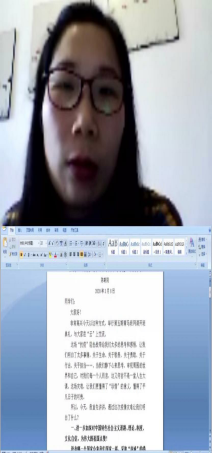 余老师还和大家分享了校党委副书记陈朝阳同志在第五期青马班网课开班典礼上的讲话。陈书记的讲话让大家倍感鼓舞。