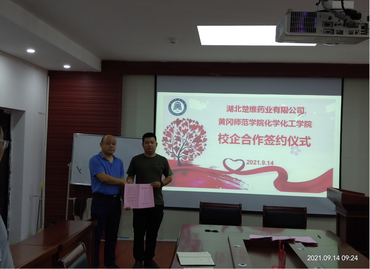 9月14日上午,湖北楚维药业有限公司总经理熊沣一行到化学化工学院洽谈校企合作及共建博士工作站等事宜,并签订校企合作协议。