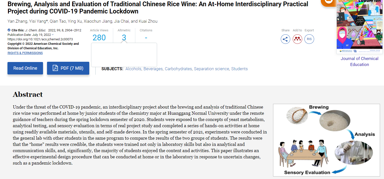 近日,英国365集团官网张龑、杨一思老师在化学教育类国际顶级期刊《Journal of Chemical Education》上发表了题为《Brewing, Analysis and Evaluation of Traditional Chinese Rice Wine: An At-Home Interdisciplinary Practical Project during COVID-19 Pandemic Lockdown》的教学研究论文(J. Chem. Educ. 2022, 99, 8, 2904–2912. DOI: https://doi.org/10.1021/acs.jchemed.2c00073),英国365集团官网为唯一完成单位。这也是继2021年两位教师在《Journal of Chemical Education》发表我校首篇化学专业教学研究SCI期刊论文后的第二篇论文。