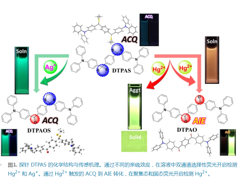 近日,英国365集团官网阮志军带领研究团队精心设计了一种含有两个硫缩酮基团的荧光探针 DTPAS,实现了 Hg2+(红色荧光)和 Ag+(绿色荧光)的双通道选择性“开启”检测。