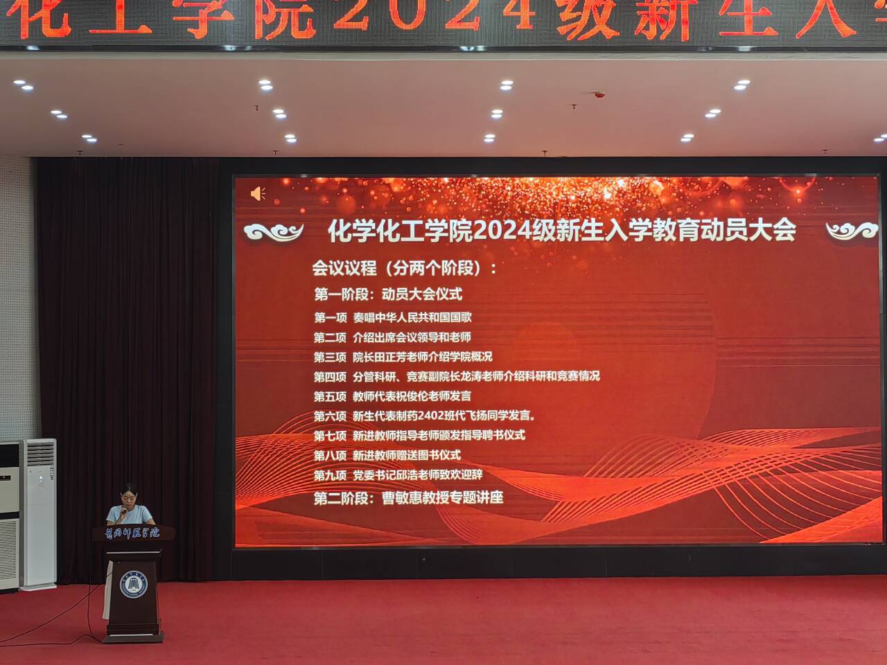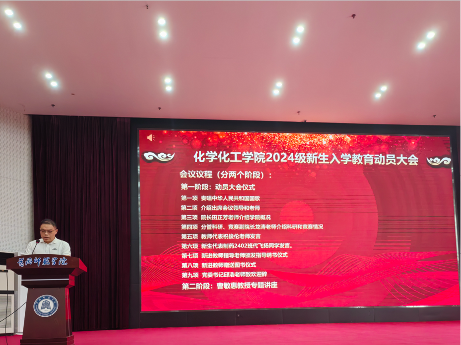 2024911日,化学化工学院2024级新生入学教育动员大会在南区学术交流中心举行。院党委书记邱浩、院长田正芳出席会议,学院办公室主任、各专业负责人和教研室主任、教学秘书、科研秘书、辅导员、新生班主任、新进教师、新进教师指导老师以及到校2024级本科生和研究生参加本次大会。大会由辅导员李东主持。