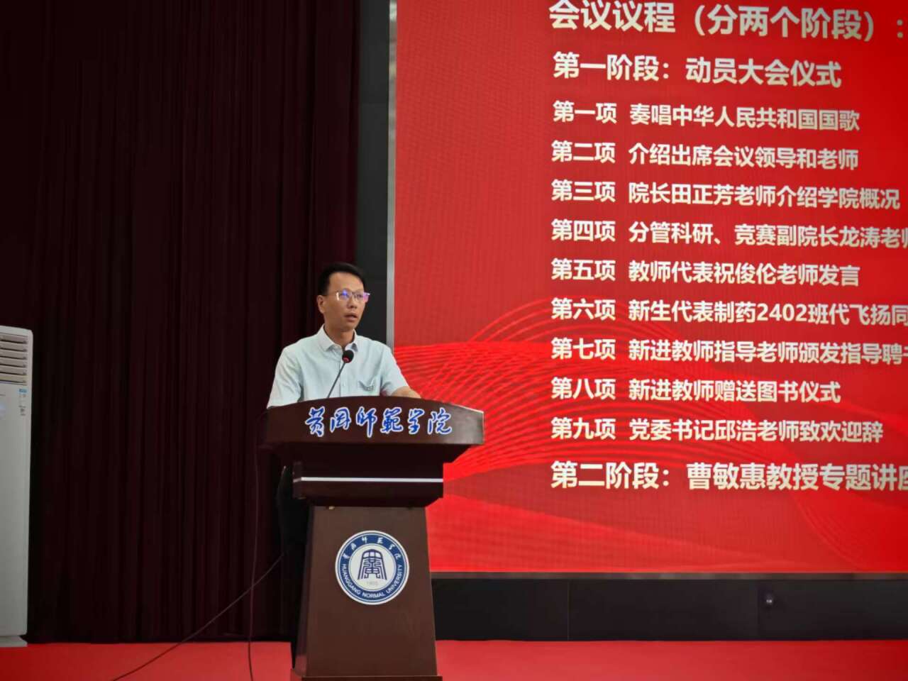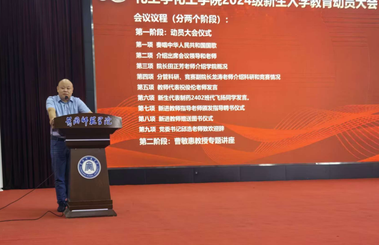 邱浩代表全院对新生的到来表示热烈的欢迎,他鼓励全体新生,一是要立德修身,笃行致远。要传承校训和黄师精神,涵养教师情怀、赓续红色血脉,端塑个人文明礼仪言行,养成敢于质疑、独立思考的能力和习惯,筑牢坚实的知识基础和完备的能力素质,找准梦想,砥砺前行。二是要明理奋进、志存高远。要科学规划好大学生活,学会选择、学会自律、杜绝网络游戏。要保持头脑清醒、明确人生目标,要立大志,做小事,做到大志之中有立场、有情怀,小事之中有规矩、有态度。三是要成人成才、奉献社会。他希望全体新生能养成良好的学习习惯,学会学习,培养终身学习的理念。能养成良好的生活习惯。学会适应,学会抗压。能养成良好的运动习惯,强身健体,保持健康的学习工作状态。良好的社交习惯,学做人、学做事,从良师,交益友。做一名只争朝夕、不负韶华的黄师时代新人。
