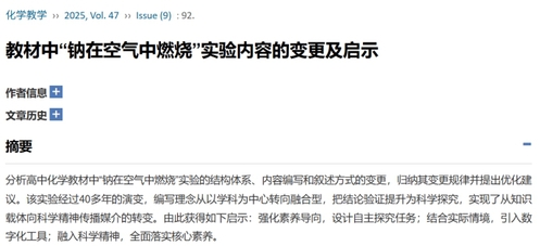 近日,我院青年教师周林楠博士在化学教育领域核心期刊《化学教学》上发表了教研论文1篇,题目为“教材中‘钠在空气中燃烧’实验内容的变更及启示”(化学教学,2025,47(9):92)。该文由周林楠博士担任第一作者,我院蒋小春副教授、田正芳教授参与了相关研究工作,华东师范大学附属东昌中学马善恒老师为通讯作者。这项研究得到湖北省教育厅基础教学研究项目基金的资助。