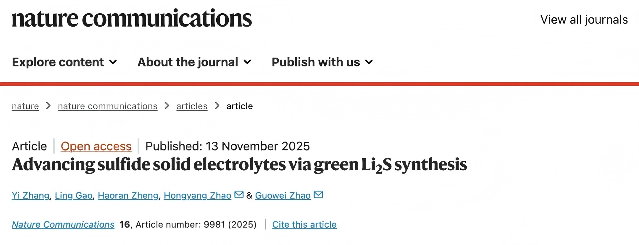 11月13日,我校化学化工学院赵国伟教授研究团队以我校为第一单位在《Nature》子刊《Nature Communications》 (《自然·通讯》)发表题为“Advancing sulfide solid electrolytes via green Li2S synthesis”的研究论文,标志着我校在全固态电池固体电解质关键材料领域取得重要研究进展。